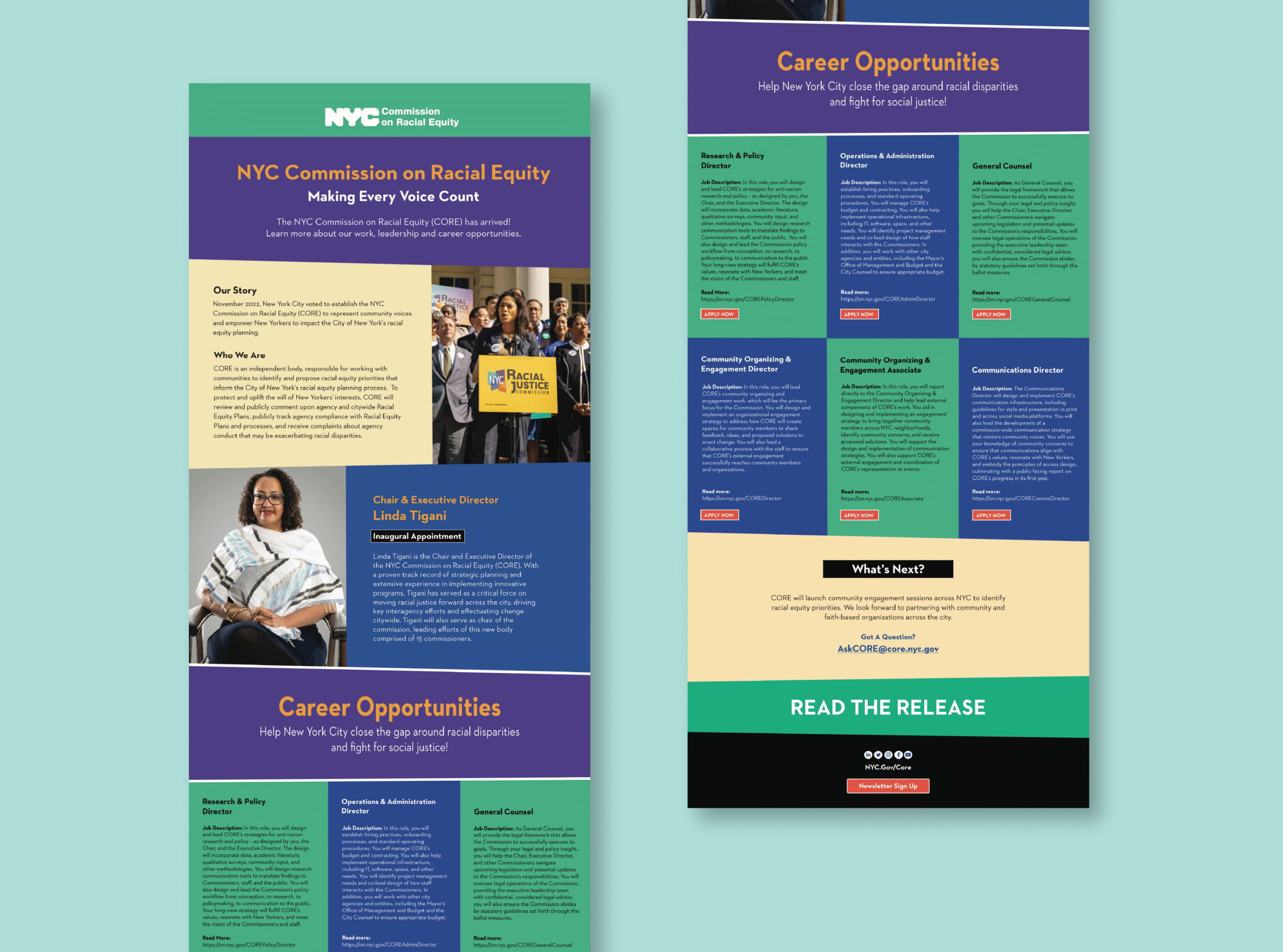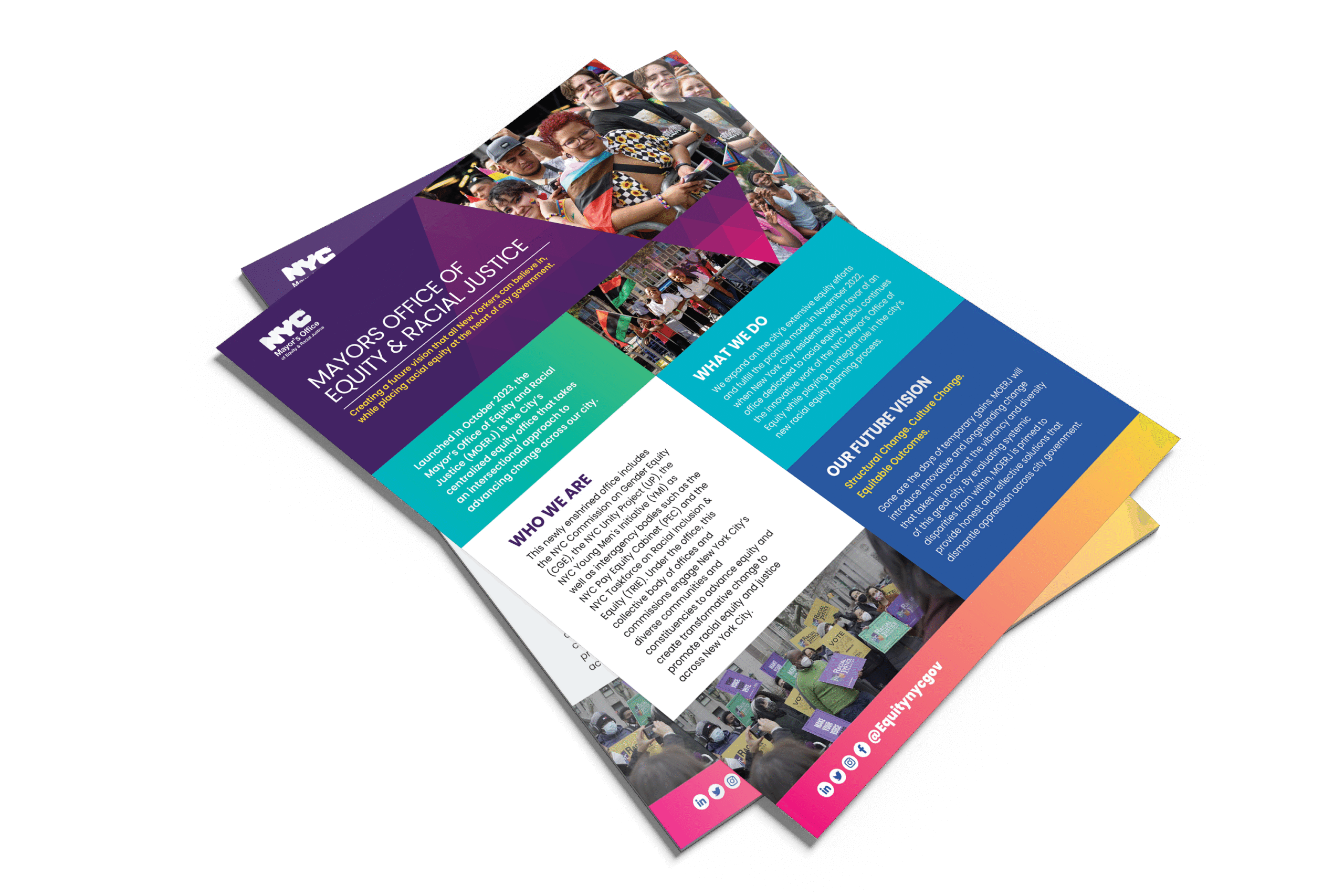 I spent 3 months working with the Mayor’s Office of Equity and Racial Justice — a brief but impactful chapter. The office carries a bold visual identity, using vibrant color palettes and layered gradients to carve out a design voice that stands apart from traditional city agency branding. During my time there, I contributed to newsletters, flyers, and social media assets, along with other supporting visual pieces. It was fast-paced, collaborative, and gave me the chance to sharpen my execution on small but strategic design deliverables.