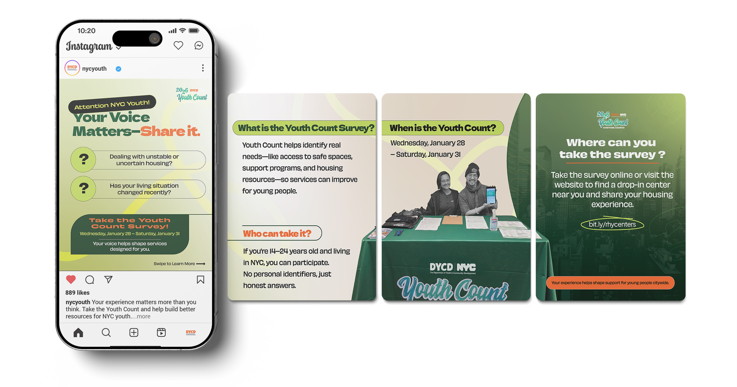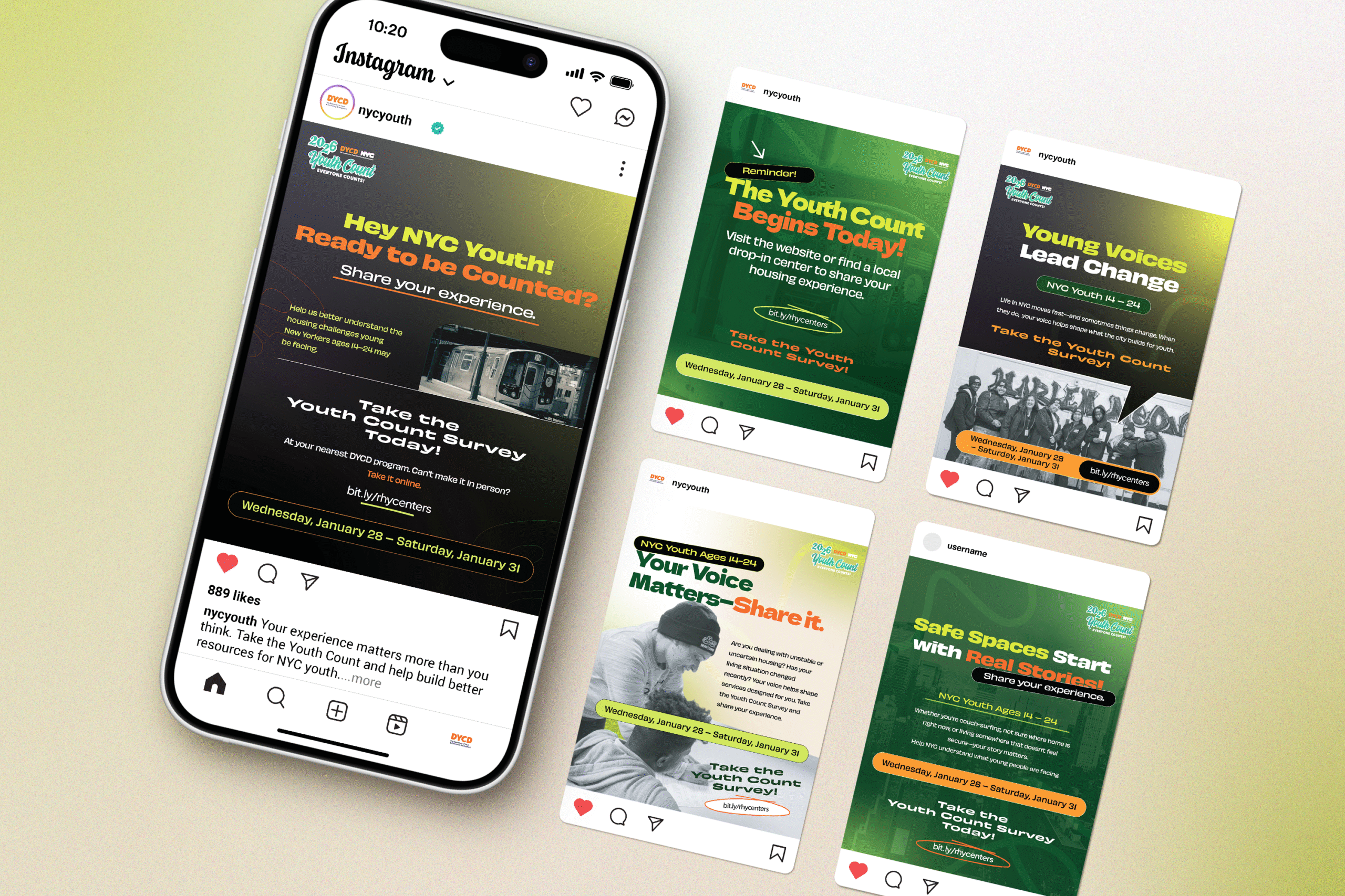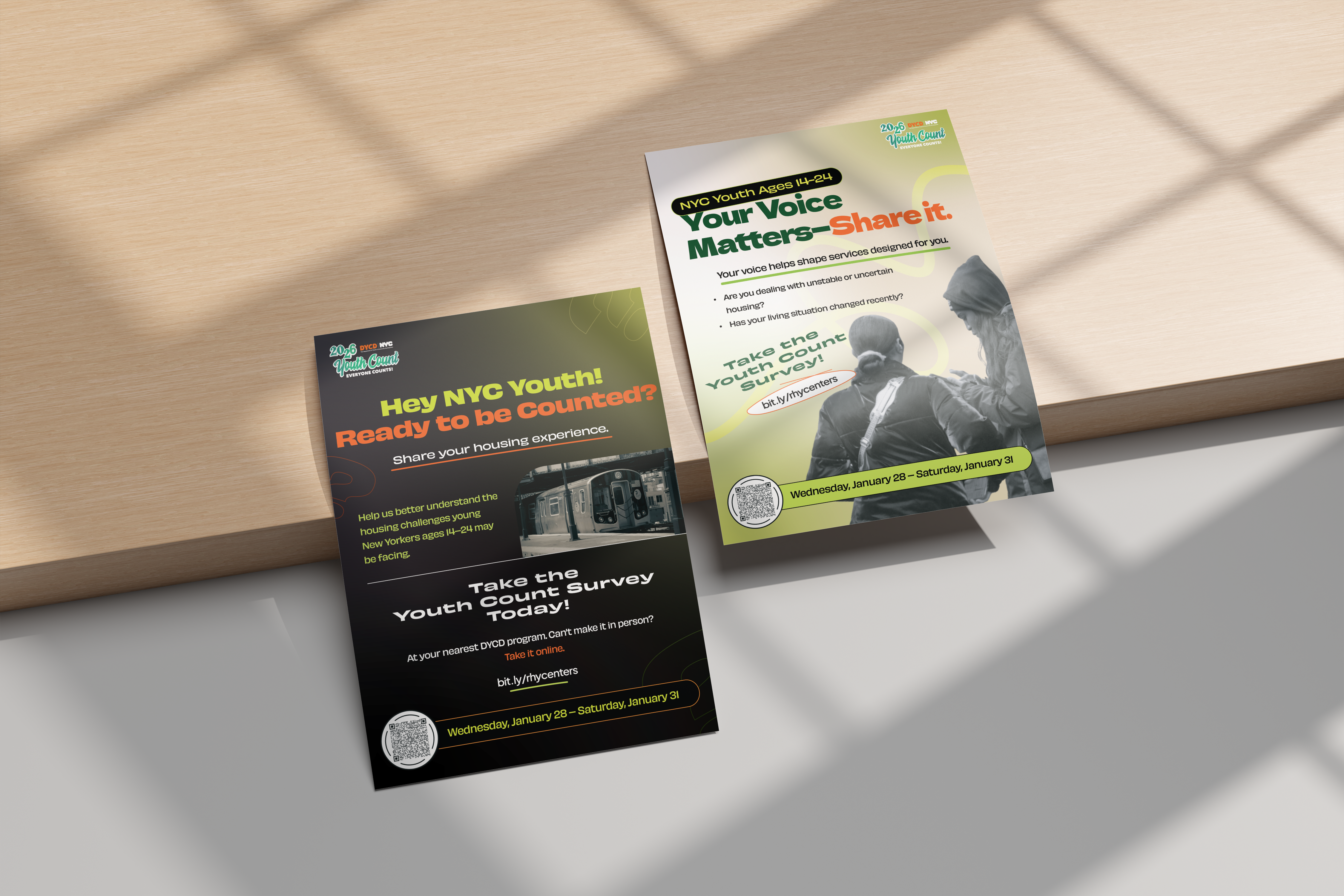 Youth Count is New York City’s annual initiative that centers youth voices through a confidential survey to better understand housing experiences, access to services, and overall well-being. For the 2026 campaign, I used bold, high-impact color combinations to immediately capture the attention of young people and cut through visual noise. The vibrant palette was designed to feel energetic, approachable, and relevant—helping make an important civic message feel accessible while maintaining clarity and consistency across digital and print materials.