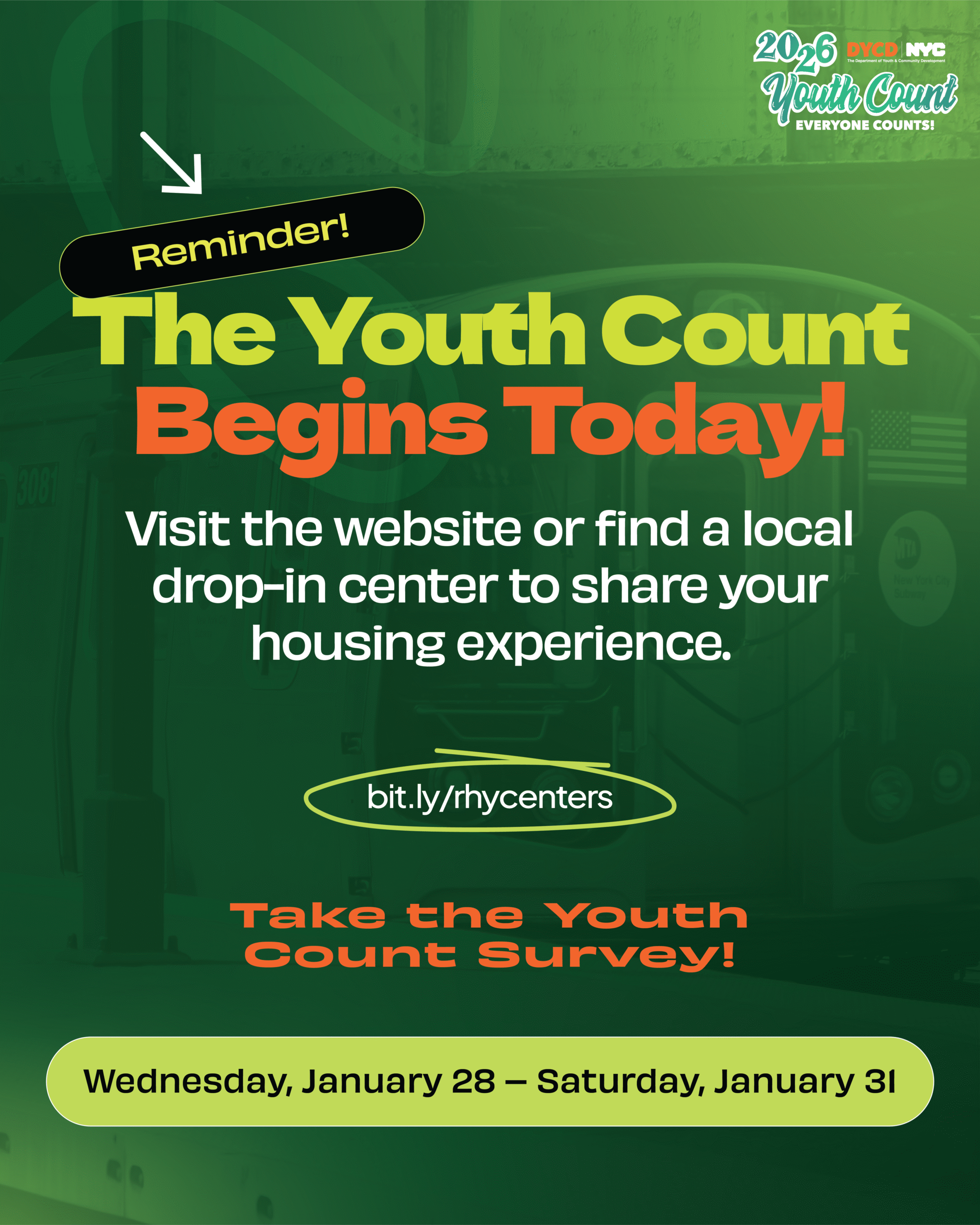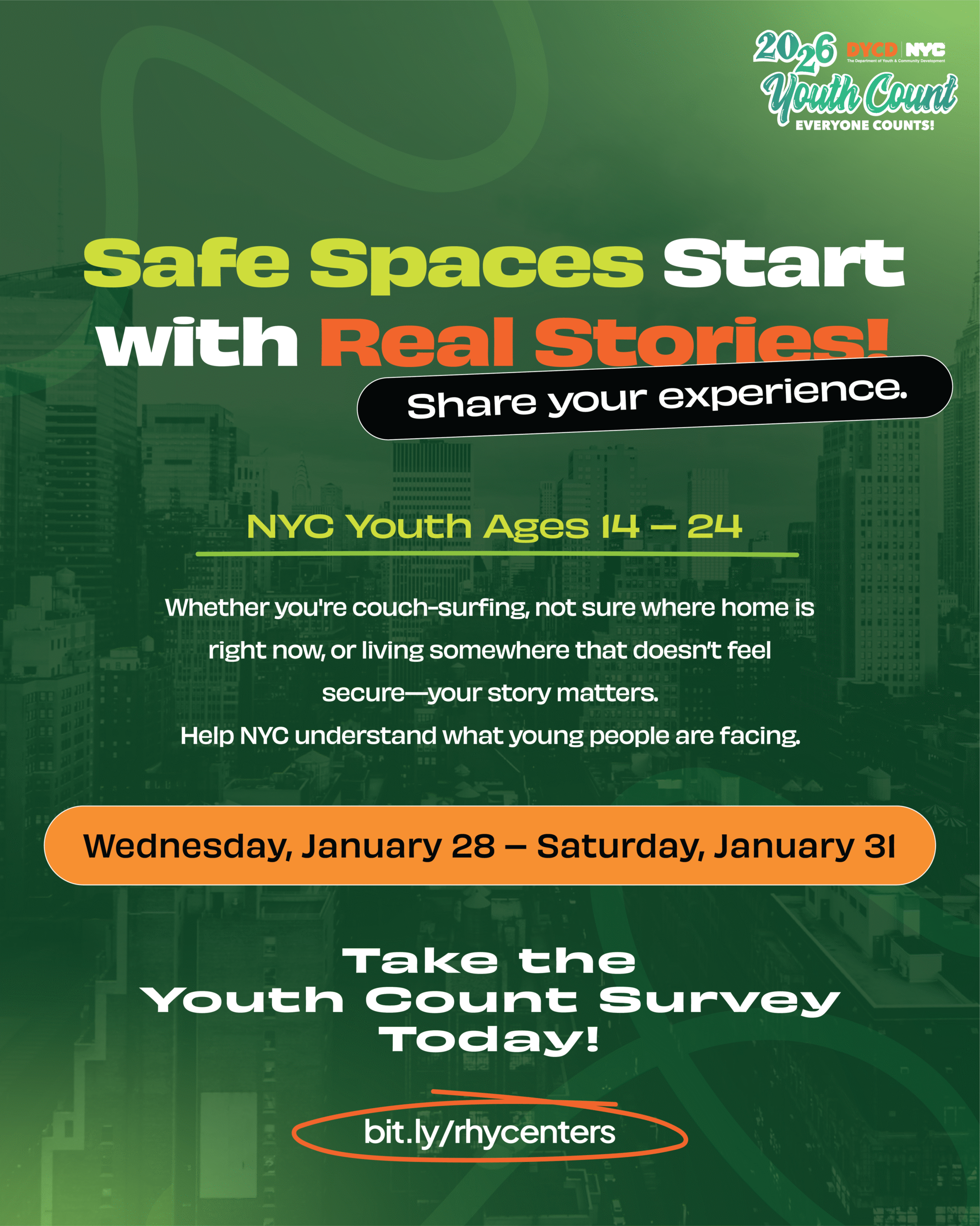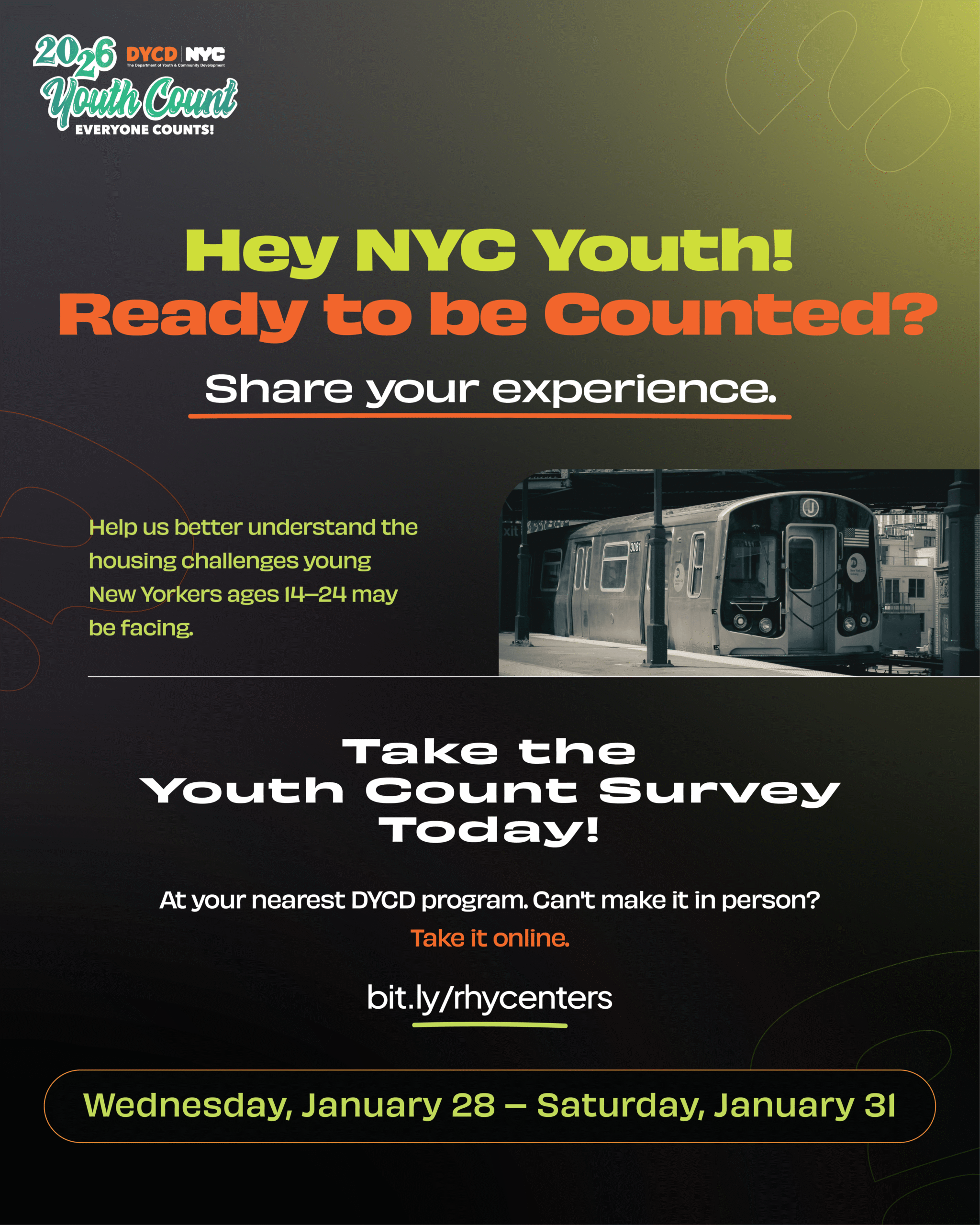 Youth Count is New York City’s annual initiative that centers youth voices through a confidential survey to better understand housing experiences, access to services, and overall well-being. For the 2026 campaign, I used bold, high-impact color combinations to immediately capture the attention of young people and cut through visual noise. The vibrant palette was designed to feel energetic, approachable, and relevant—helping make an important civic message feel accessible while maintaining clarity and consistency across digital and print materials.